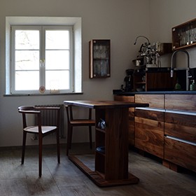 Küche in Walnuss massiv mit Steinplatte und Griffleisten. Gas und Induktion Kochfeld, Dunstabzug nach unten;
